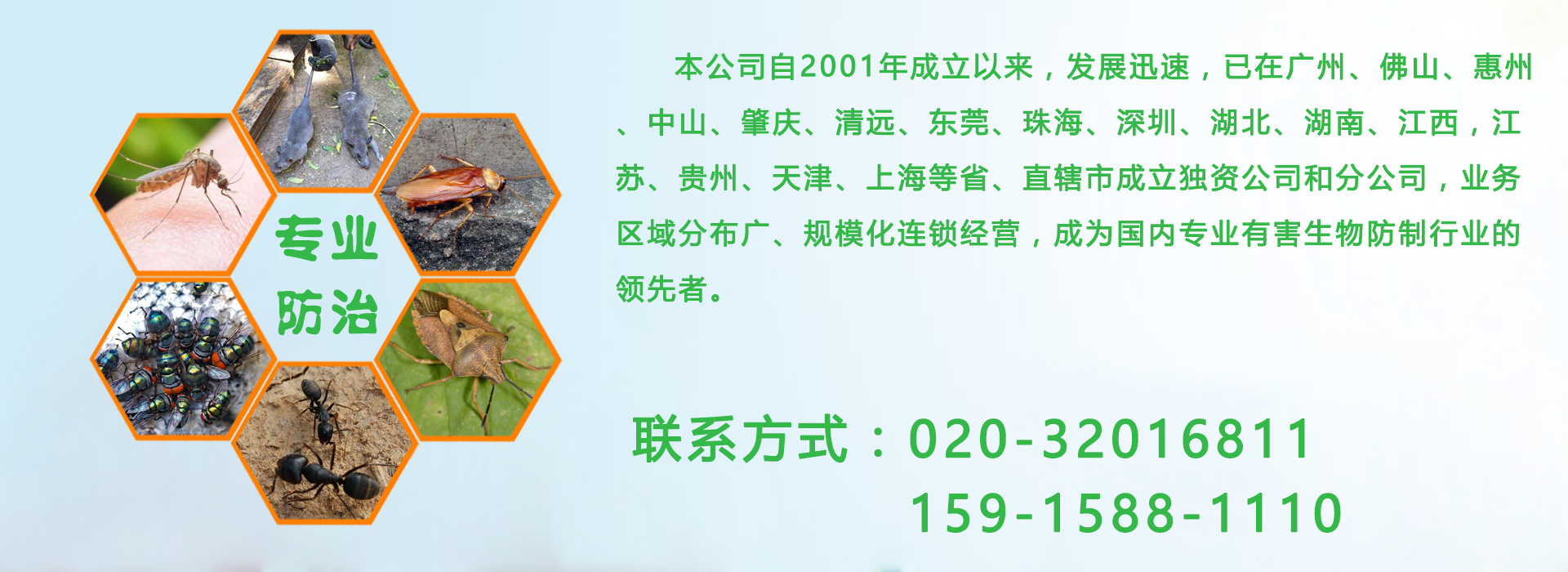 廣州億康環境科技有限公司專業從事有害生物防制、空氣治理、增香除味、清洗保潔、衛生防疫消毒。本公司自成立以來,發展迅速,業務區域分布廣、規模化連鎖經營,成為國內專業有害生物防制行業的領先者。